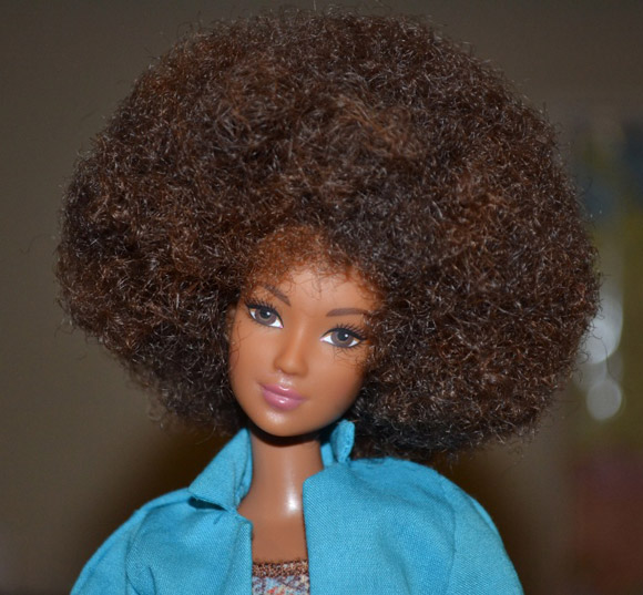 LINDA, LINDA, LINDA! Dizem que estes modelos surgiram recentemente após uma boa ação de mulheres negras assumidas no EUA que querem distribuir bonecas assim pela cidade de Columbus para crianças carentes, todas serão assim com o cabelo modificado. :) Achei a ideia mara *-* chega de criança querendo ser loira de cabelo liso só porque nunca viu uma bonequinha assim.